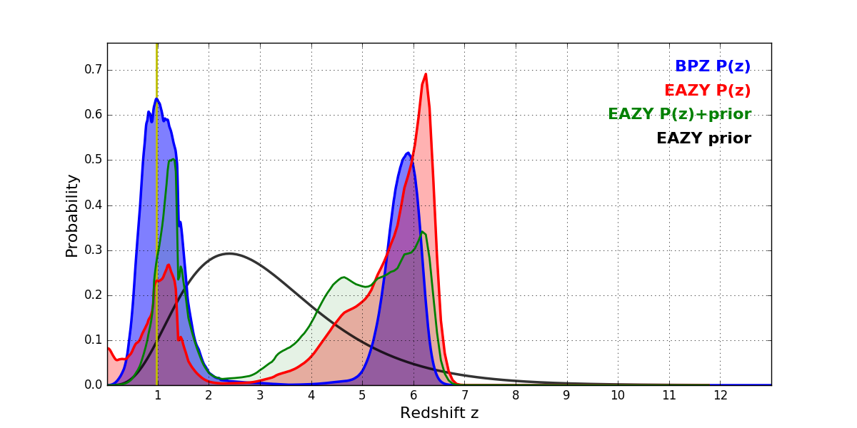 In P(z) plots: Yellow lines mark the cluster redshift z = 0.972,