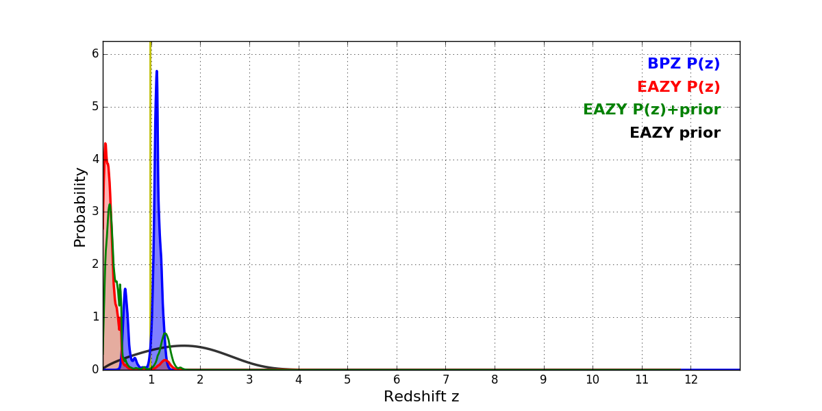 In P(z) plots: Yellow lines mark the cluster redshift z = 0.972,