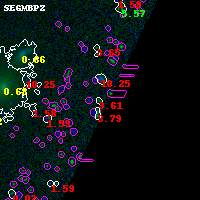 Black segments are analyzed here. Roll mouse over color images to view segments. Best viewed in a wide browser window (1200 pixels or more). Download SED & P(z) plots to view larger versions.