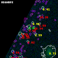 Black segments are analyzed here. Roll mouse over color images to view segments. Best viewed in a wide browser window (1200 pixels or more). Download SED & P(z) plots to view larger versions.