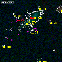 Black segments are analyzed here. Roll mouse over color images to view segments. Best viewed in a wide browser window (1200 pixels or more). Download SED & P(z) plots to view larger versions.