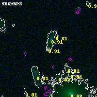 Black segments are analyzed here. Roll mouse over color images to view segments. Best viewed in a wide browser window (1200 pixels or more). Download SED & P(z) plots to view larger versions.