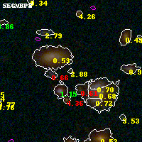 Black segments are analyzed here. Roll mouse over color images to view segments. Best viewed in a wide browser window (1200 pixels or more). Download SED & P(z) plots to view larger versions.