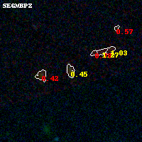 Object #1001 x,y = (2697, 1205) RA, Dec = (01:37:24.312, -8:28:39.36) = (24.35130, -8.47760) BPZ = 0.445 [0.066--3.376] type = 7.70 (SB1_B10 - Scd_B10) chisq2 = 0.26 ODDS = 0.16 z_cluster = 0.566