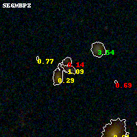 Object #445 x,y = (3289, 2568) RA, Dec = (01:37:21.936, -8:27:17.64) = (24.34140, -8.45490) BPZ = 1.089 [0.151--1.349] type = 7.60 (SB1_B10 - Scd_B10) chisq2 = 0.67 ODDS = 0.30 z_cluster = 0.566