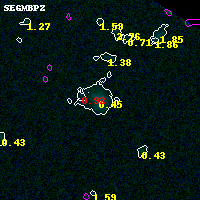 Object #202 x,y = (2267, 4487) RA, Dec = (01:37:26.064, -8:25:22.44) = (24.35860, -8.42290) BPZ = 0.445 [0.089--2.249] type = 9.70 (SB3_B10 - SB2_B10) chisq2 = 0.02 ODDS = 0.37 z_cluster = 0.566