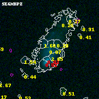 Object #2219 x,y = (4191, 2779) RA, Dec = (01:37:18.288, -8:27:05.04) = (24.32620, -8.45140) BPZ = 0.068 [0.032--2.796] type = 10.20 (SB3_B10 - SB11_A_0_l) chisq2 = 0.02 ODDS = 0.87 z_cluster = 0.566