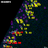 Object #2590 x,y = (613, 2679) RA, Dec = (01:37:32.760, -8:27:10.80) = (24.38650, -8.45300) BPZ = 4.018 [0.182--4.181] type = 10.00 (SB3_B10) chisq2 = 0.10 ODDS = 0.47 z_cluster = 0.566