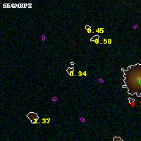 Object #4255 x,y = (2043, 1824) RA, Dec = (01:37:26.976, -8:28:02.28) = (24.36240, -8.46730) BPZ = 0.338 [0.120--3.870] type = 7.80 (SB1_B10 - Scd_B10) chisq2 = 0.66 ODDS = 0.15 z_cluster = 0.566