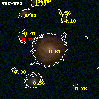 Object #4380 x,y = (3534, 1709) RA, Dec = (01:37:20.952, -8:28:09.12) = (24.33730, -8.46920) BPZ = 0.608 [0.556--0.700] type = 6.30 (Sbc_B10 - Scd_B10) chisq2 = 0.02 ODDS = 0.87 z_cluster = 0.566
