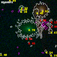 Object #4639 x,y = (1671, 1556) RA, Dec = (01:37:28.464, -8:28:18.12) = (24.36860, -8.47170) BPZ = 0.780 [0.736--0.998] type = 5.80 (Sbc_B10 - ES0_B10) chisq2 = 0.01 ODDS = 0.71 z_cluster = 0.566