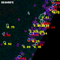 Object #4885 x,y = (3887, 1444) RA, Dec = (01:37:19.512, -8:28:24.96) = (24.33130, -8.47360) BPZ = 5.916 [1.521--9.696] type = 6.00 (Sbc_B10) chisq2 = 0.18 ODDS = 0.19 z_cluster = 0.566