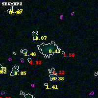 Object #5463 x,y = (2348, 966) RA, Dec = (01:37:25.728, -8:28:53.76) = (24.35720, -8.48160) BPZ = 0.130 [0.036--2.578] type = 8.60 (SB2_B10 - SB1_B10) chisq2 = 0.00 ODDS = 0.40 z_cluster = 0.566