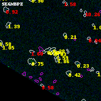 Object #5642 x,y = (2080, 844) RA, Dec = (01:37:26.832, -8:29:00.96) = (24.36180, -8.48360) BPZ = 0.539 [0.156--3.370] type = 9.30 (SB2_B10 - SB3_B10) chisq2 = 0.11 ODDS = 0.05 z_cluster = 0.566