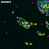 Object #585 x,y = (2980, 4010) RA, Dec = (01:37:23.184, -8:25:50.88) = (24.34660, -8.43080) BPZ = 0.491 [0.089--2.827] type = 7.00 (Scd_B10) chisq2 = 0.00 ODDS = 0.58 z_cluster = 0.566