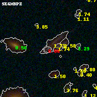 Object #112 x,y = (2025, 3294) RA, Dec = (01:37:27.048, -8:26:34.08) = (24.36270, -8.44280) BPZ = 0.060 [0.017--1.677] type = 7.80 (SB1_B10 - Scd_B10) chisq2 = 1.48 ODDS = 0.70 z_cluster = 0.566