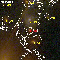 Object #610 x,y = (2623, 2586) RA, Dec = (01:37:24.624, -8:27:16.56) = (24.35260, -8.45460) BPZ = 0.498 [0.456--0.525] type = 4.00 (Ell4_A_0) chisq2 = 1.66 ODDS = 1.00 z_cluster = 0.566