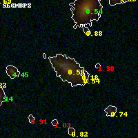 Object #614 x,y = (3330, 2384) RA, Dec = (01:37:21.768, -8:27:28.44) = (24.34070, -8.45790) BPZ = 0.593 [0.452--0.678] type = 7.80 (SB1_B10 - Scd_B10) chisq2 = 0.16 ODDS = 0.73 z_cluster = 0.566