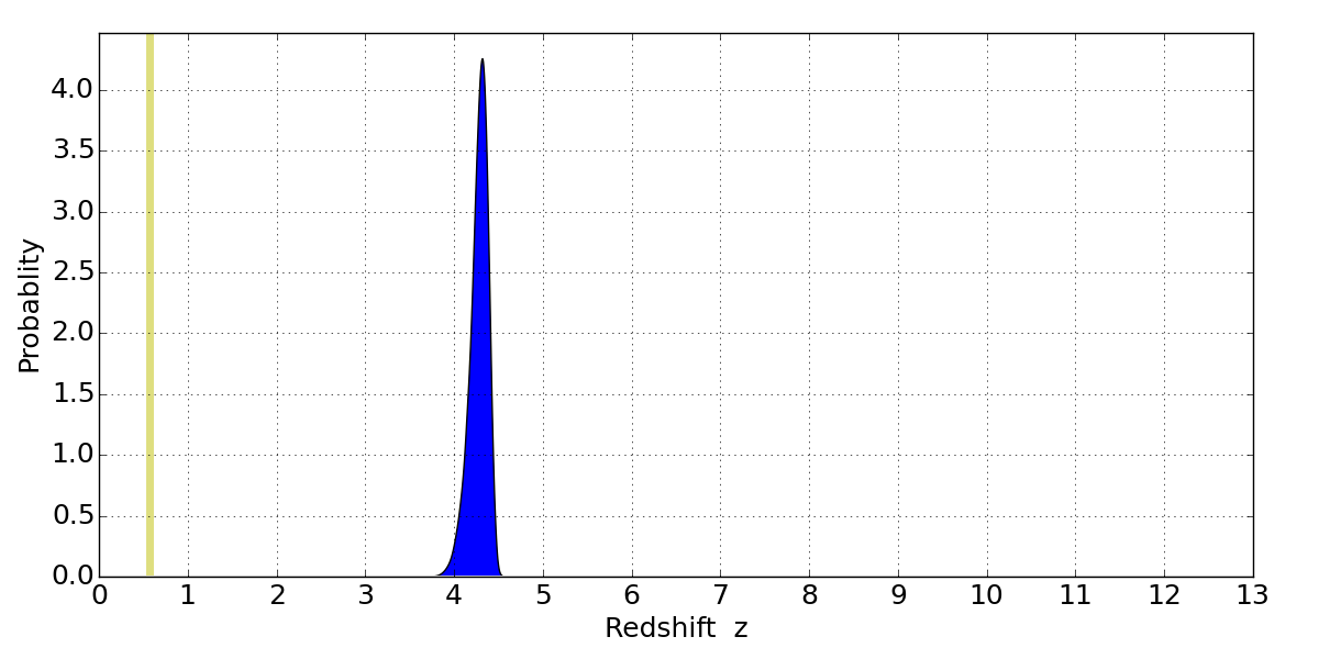 In P(z) plots: Yellow lines mark the cluster redshift z = 0.566,