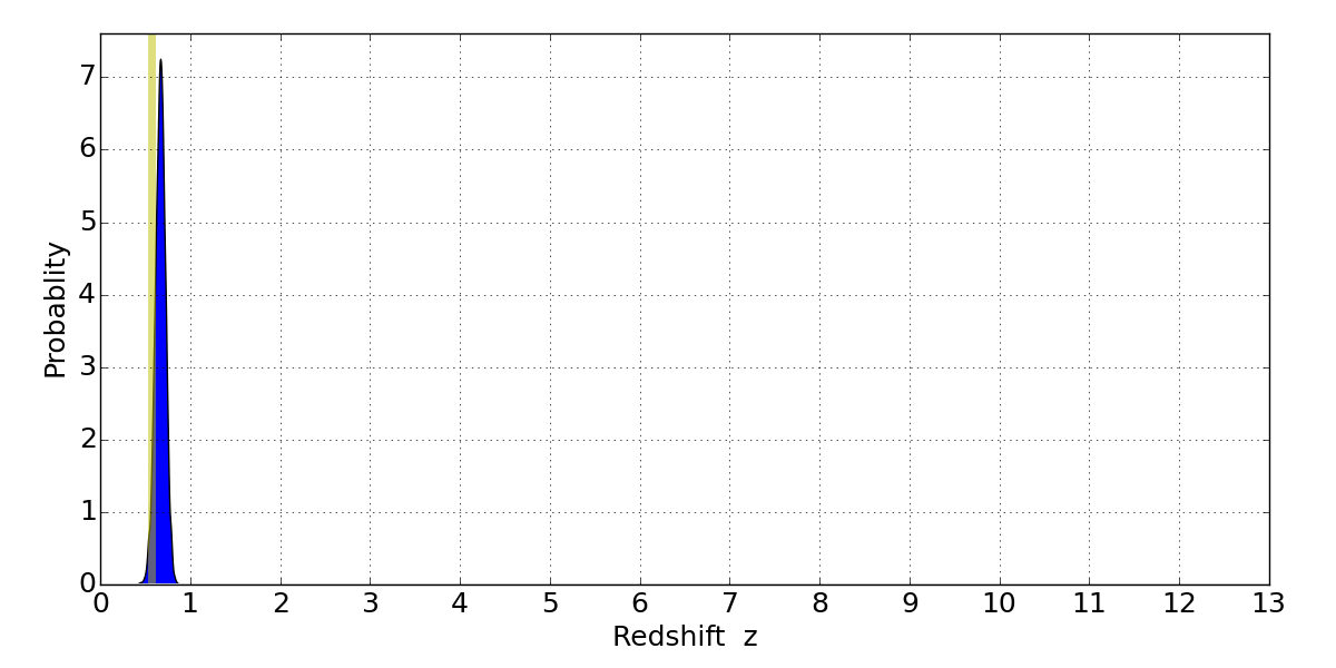 In P(z) plots: Yellow lines mark the cluster redshift z = 0.566,