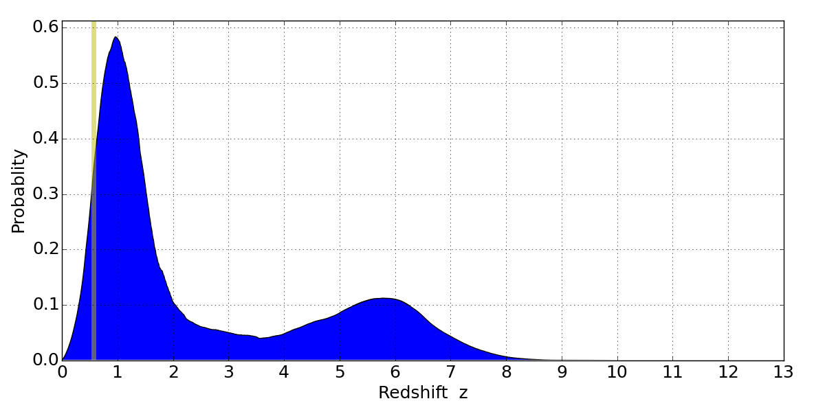 In P(z) plots: Yellow lines mark the cluster redshift z = 0.566,
