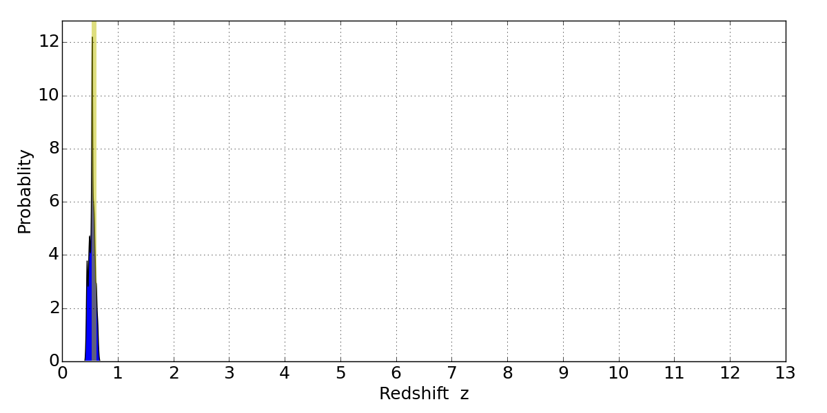 In P(z) plots: Yellow lines mark the cluster redshift z = 0.566,