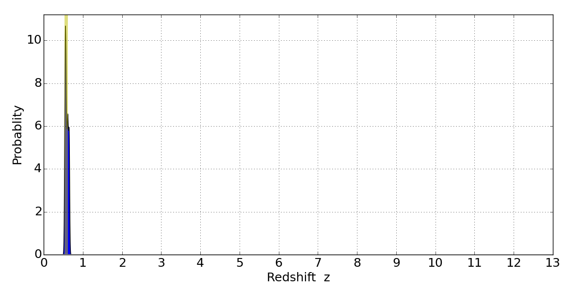 In P(z) plots: Yellow lines mark the cluster redshift z = 0.566,