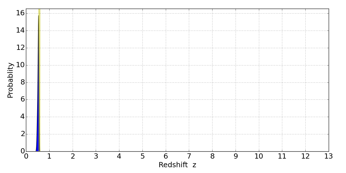 In P(z) plots: Yellow lines mark the cluster redshift z = 0.566,