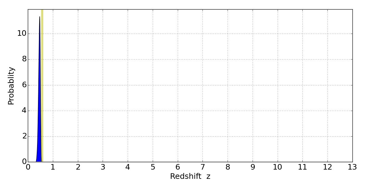 In P(z) plots: Yellow lines mark the cluster redshift z = 0.566,