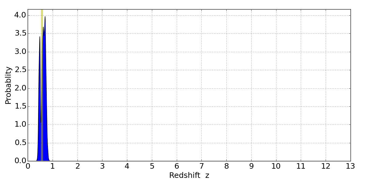 In P(z) plots: Yellow lines mark the cluster redshift z = 0.566,