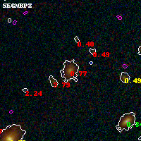 Object #1261 x,y = (3097, 3733) RA, Dec = (01:37:22.704, -8:26:07.80) = (24.34460, -8.43550) BPZ = 0.773 [0.621--0.913] type = 7.00 (Scd_B10) chisq2 = 2.77 ODDS = 0.68 z_cluster = 0.566