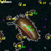 Object #5387 x,y = (2448, 1735) RA, Dec = (01:37:25.320, -8:28:07.68) = (24.35550, -8.46880) BPZ = 0.591 [0.543--0.644] type = 8.20 (SB1_B10 - SB2_B10) chisq2 = 0.53 ODDS = 0.99 z_cluster = 0.566