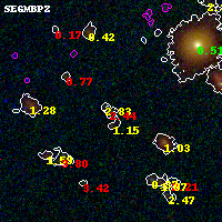 Object #5408 x,y = (2062, 1753) RA, Dec = (01:37:26.880, -8:28:06.24) = (24.36200, -8.46840) BPZ = 2.438 [0.556--2.995] type = 10.40 (SB3_B10 - SB11_A_0_l) chisq2 = 1.11 ODDS = 0.20 z_cluster = 0.566