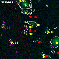 Object #5420 x,y = (3806, 1738) RA, Dec = (01:37:19.824, -8:28:07.32) = (24.33260, -8.46870) BPZ = 0.197 [0.121--3.086] type = 8.70 (SB2_B10 - SB1_B10) chisq2 = 1.87 ODDS = 0.06 z_cluster = 0.566