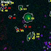 Object #5593 x,y = (3886, 1664) RA, Dec = (01:37:19.512, -8:28:11.64) = (24.33130, -8.46990) BPZ = 0.301 [0.158--3.666] type = 9.00 (SB2_B10) chisq2 = 1.09 ODDS = 0.11 z_cluster = 0.566