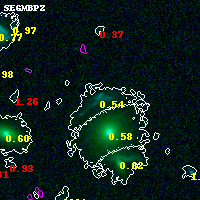 Object #6582 x,y = (2853, 1027) RA, Dec = (01:37:23.688, -8:28:50.16) = (24.34870, -8.48060) BPZ = 0.540 [0.233--0.666] type = 9.10 (SB2_B10 - SB3_B10) chisq2 = 0.01 ODDS = 0.63 z_cluster = 0.566