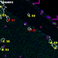 Object #883 x,y = (3215, 4005) RA, Dec = (01:37:22.224, -8:25:51.24) = (24.34260, -8.43090) BPZ = 1.149 [0.194--2.485] type = 9.40 (SB2_B10 - SB3_B10) chisq2 = 8.31 ODDS = 0.12 z_cluster = 0.566