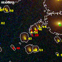 Object #1116 x,y = (2407, 2222) RA, Dec = (01:37:25.488, -8:27:38.16) = (24.35620, -8.46060) BPZ = 0.557 [0.253--3.911] type = 7.60 (SB1_B10 - Scd_B10) chisq2 = 0.68 ODDS = 0.05 z_cluster = 0.566