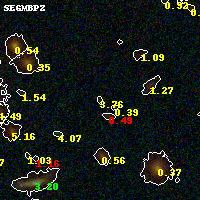 Object #1363 x,y = (2618, 1964) RA, Dec = (01:37:24.648, -8:27:53.64) = (24.35270, -8.46490) BPZ = 3.762 [0.251--4.416] type = 9.40 (SB2_B10 - SB3_B10) chisq2 = 0.34 ODDS = 0.25 z_cluster = 0.566