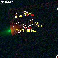 Object #155 x,y = (1389, 3454) RA, Dec = (01:37:29.616, -8:26:24.36) = (24.37340, -8.44010) BPZ = 6.417 [1.174--10.957] type = 9.30 (SB2_B10 - SB3_B10) chisq2 = 0.48 ODDS = 0.29 z_cluster = 0.566