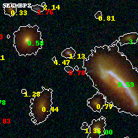 Object #1558 x,y = (2385, 1741) RA, Dec = (01:37:25.584, -8:28:06.96) = (24.35660, -8.46860) BPZ = 0.777 [0.411--1.103] type = 10.50 (SB11_A_0_l - SB3_B10) chisq2 = 1.48 ODDS = 0.34 z_cluster = 0.566