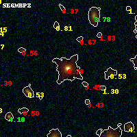Object #1629 x,y = (2231, 1622) RA, Dec = (01:37:26.208, -8:28:14.16) = (24.35920, -8.47060) BPZ = 0.761 [0.727--0.781] type = 4.00 (Ell4_A_0) chisq2 = 3.47 ODDS = 1.00 z_cluster = 0.566