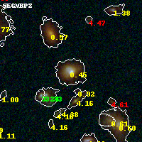 Object #1650 x,y = (3288, 1610) RA, Dec = (01:37:21.936, -8:28:14.88) = (24.34140, -8.47080) BPZ = 0.449 [0.423--0.600] type = 7.60 (SB1_B10 - Scd_B10) chisq2 = 0.35 ODDS = 0.52 z_cluster = 0.566
