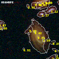 Object #80 x,y = (2094, 3557) RA, Dec = (01:37:26.760, -8:26:18.24) = (24.36150, -8.43840) BPZ = 0.392 [0.191--0.780] type = 7.50 (SB1_B10 - Scd_B10) chisq2 = 0.02 ODDS = 0.45 z_cluster = 0.566