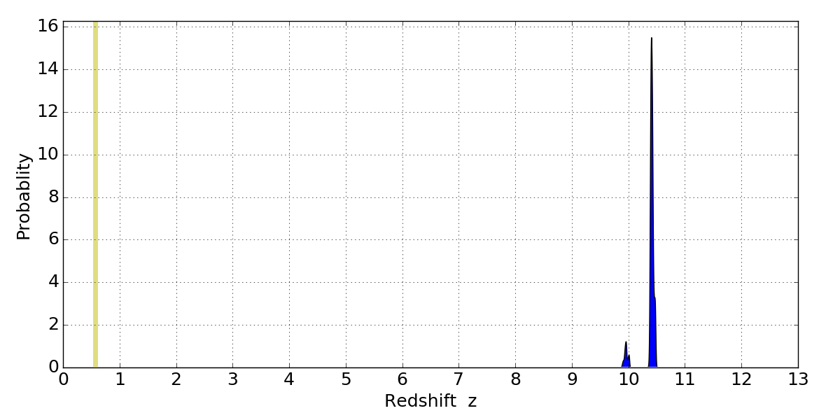 In P(z) plots: Yellow lines mark the cluster redshift z = 0.566,