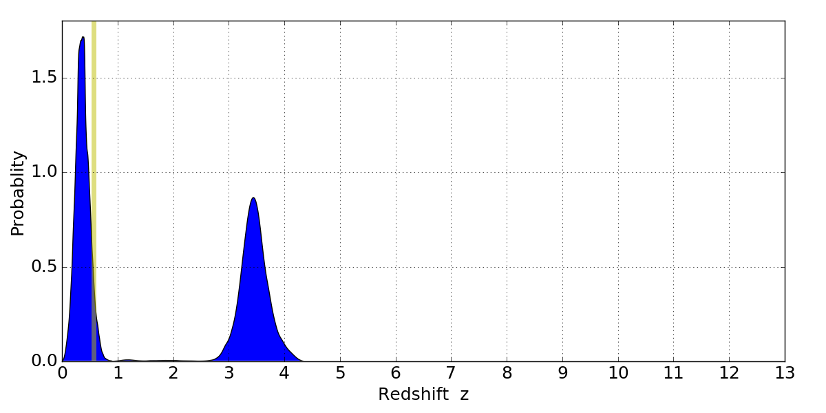 In P(z) plots: Yellow lines mark the cluster redshift z = 0.566,