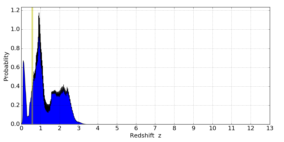 In P(z) plots: Yellow lines mark the cluster redshift z = 0.566,