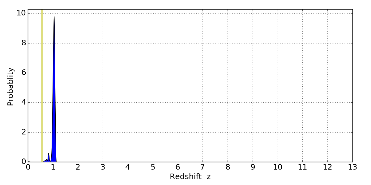 In P(z) plots: Yellow lines mark the cluster redshift z = 0.566,