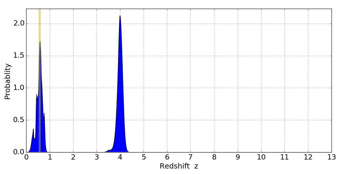 In P(z) plots: Yellow lines mark the cluster redshift z = 0.566,