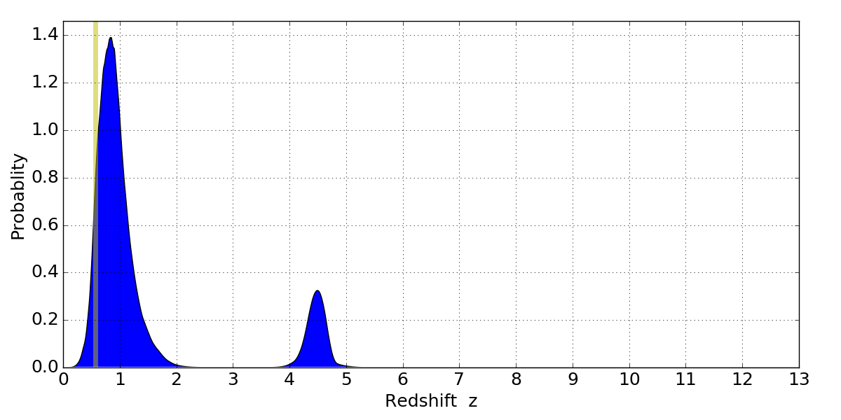 In P(z) plots: Yellow lines mark the cluster redshift z = 0.566,